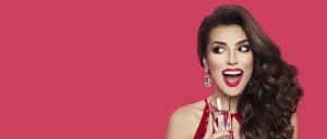 Beautiful brunette girl in evening dress smiling and looking left, holding glass of champagne